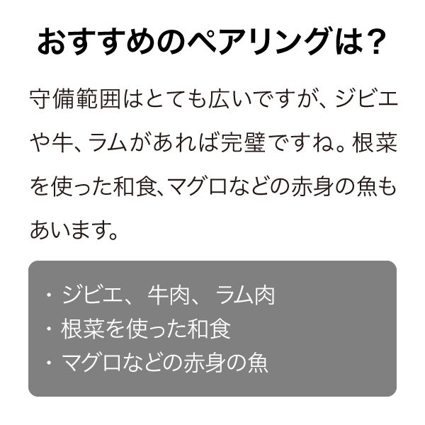 Its range of applications is very wide, but it would be perfect with game, beef, or lamb. It also goes well with Japanese dishes using root vegetables and red fish such as tuna.