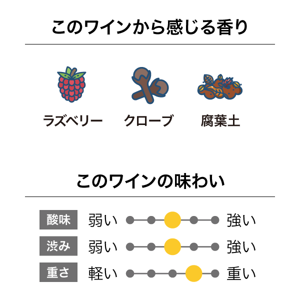 The taste, like the aroma, is rich in cassis, raspberry, clove, etc. It has a firm acidity and is very elegant.