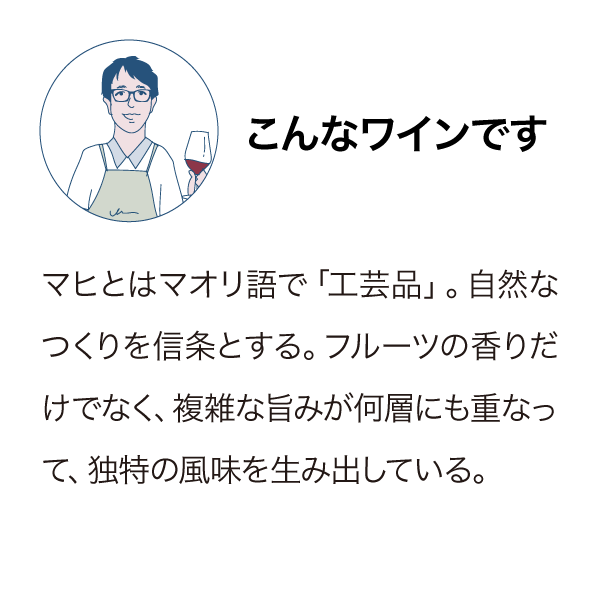 Mahi means "craft" in Maori. We believe in natural manufacturing. This Pinot Noir has a unique flavor that is not only fruity but also has many layers of complex flavors.