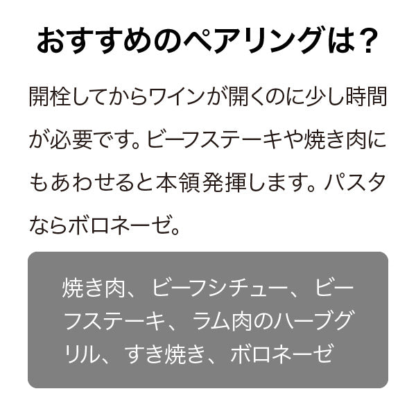 ※ワインには、浮遊物による濁りが生じているものや、澱(おり)と呼ばれる沈澱物が含まれている場合があります。これらは、ワインを製造・熟成する過程で生じるものであり、品質には問題ありません。また、身体への影響もありませんので、安心してお召し上がりください。