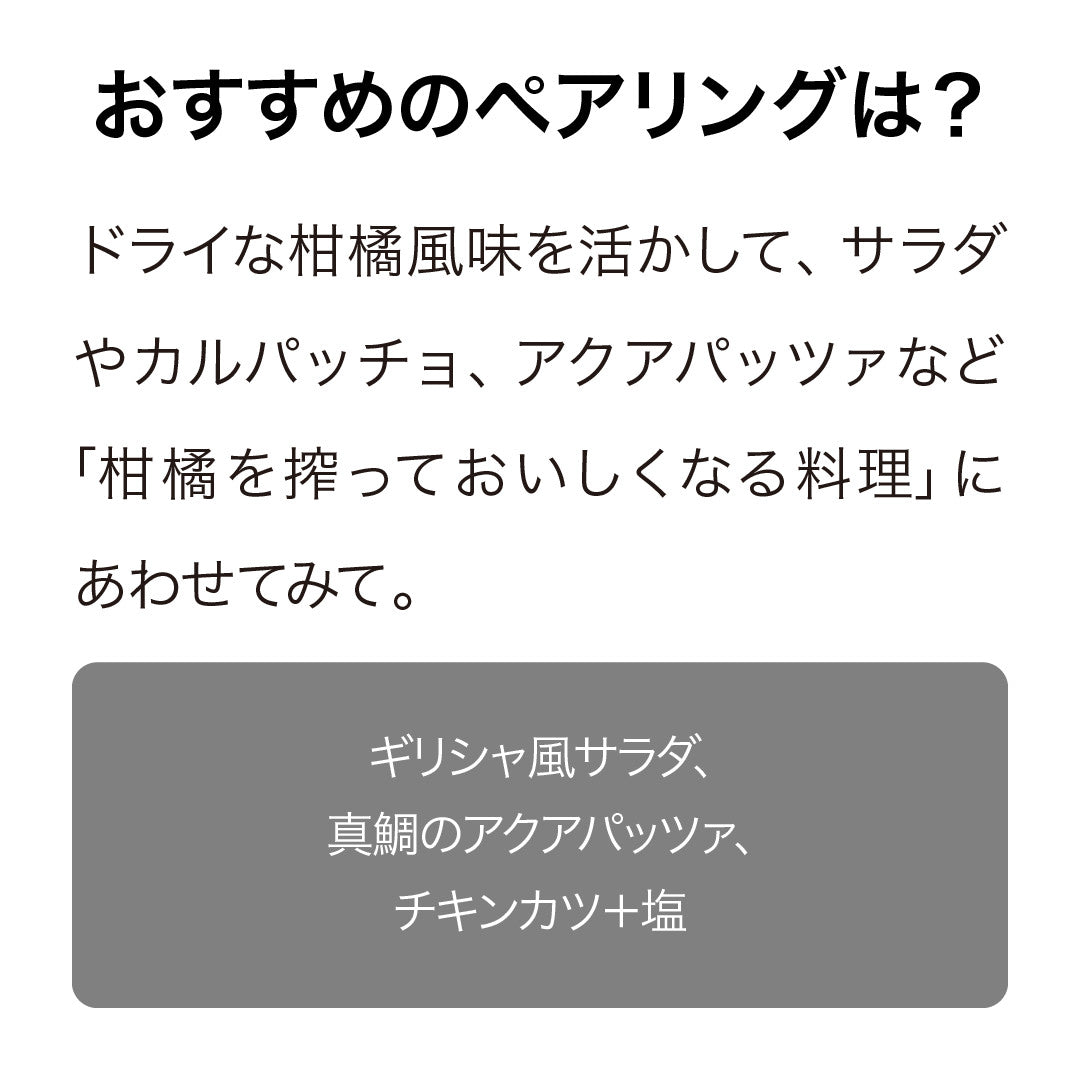 ドライな柑橘風味を活かして、サラダやカルパッチョ、アクアパッツァなど「柑橘を搾っておいしくなる料理」にあわせてみてください。