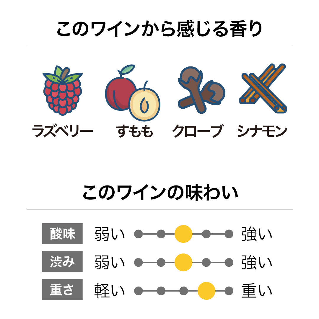 香りはラズベリーやプラムの完熟果実に、クローブやシナモンといったスパイスが溶け合う芳醇なアロマ。奥に土のニュアンスやローズヒップのような赤い花の香りも潜んでいます。