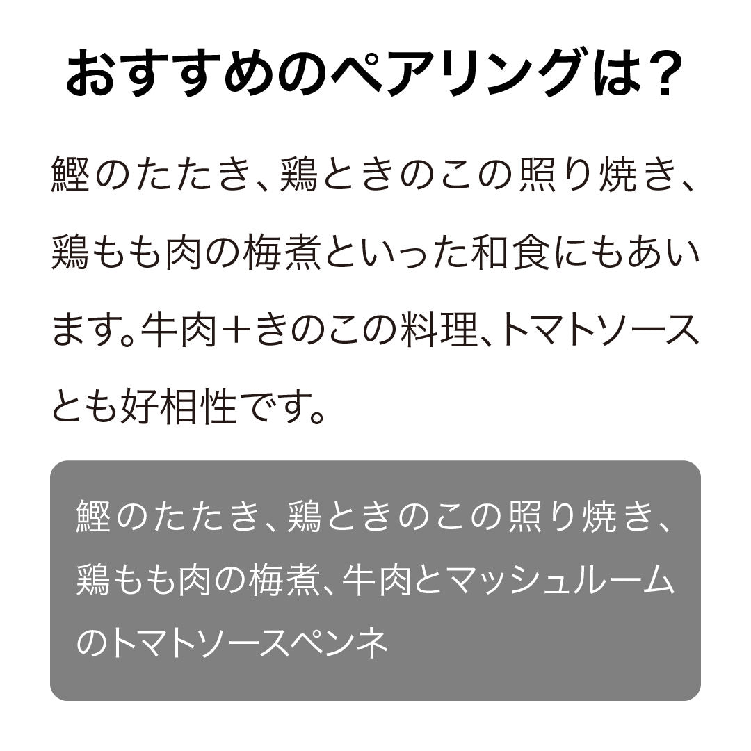 味わいは果実の明るさに土っぽさとバタースコッチのような柔らかい甘みが重なり、ピノ・ノワールらしい軽快さと深みを兼ね備えています。