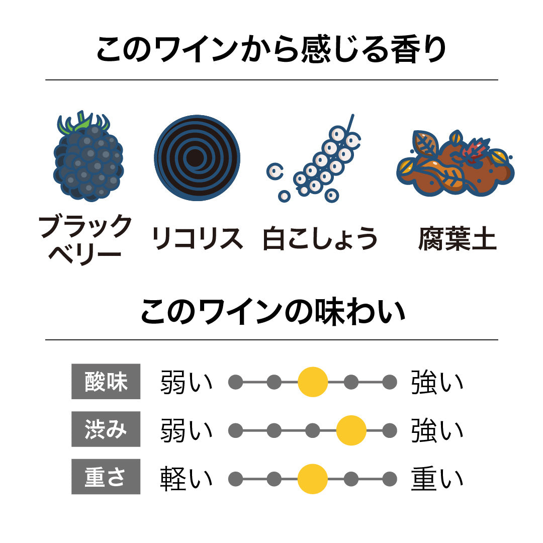 香りはブラックベリーやラズベリー、ダークチェリーに、スモーキーなジビエや黒胡椒、ドライハーブ、ベイリーフのアクセント。冷涼産地らしい花の香りも漂います。
