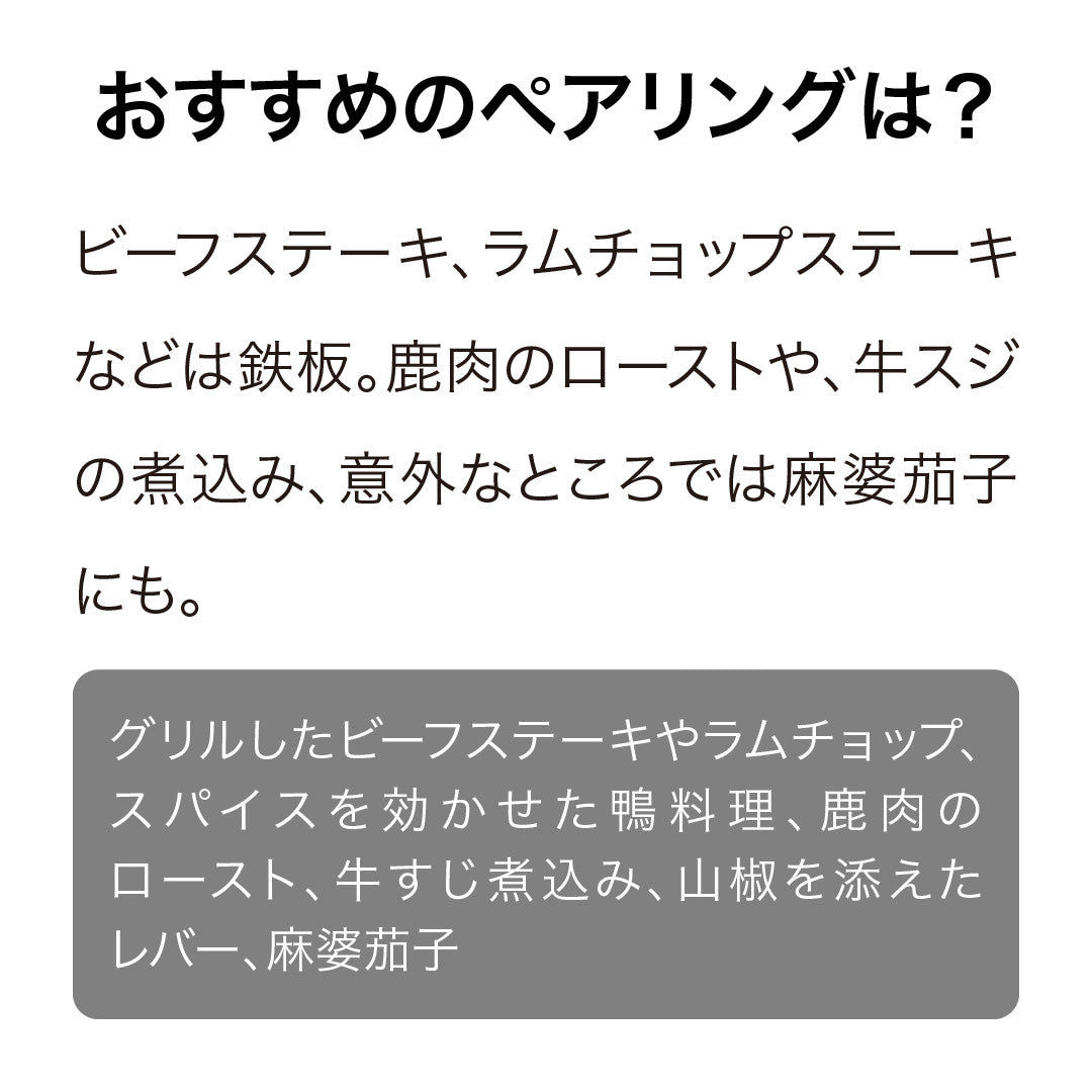 赤身肉やスパイス料理と相性抜群。重すぎないスタイルなので、幅広い肉料理に合わせやすい一本です。