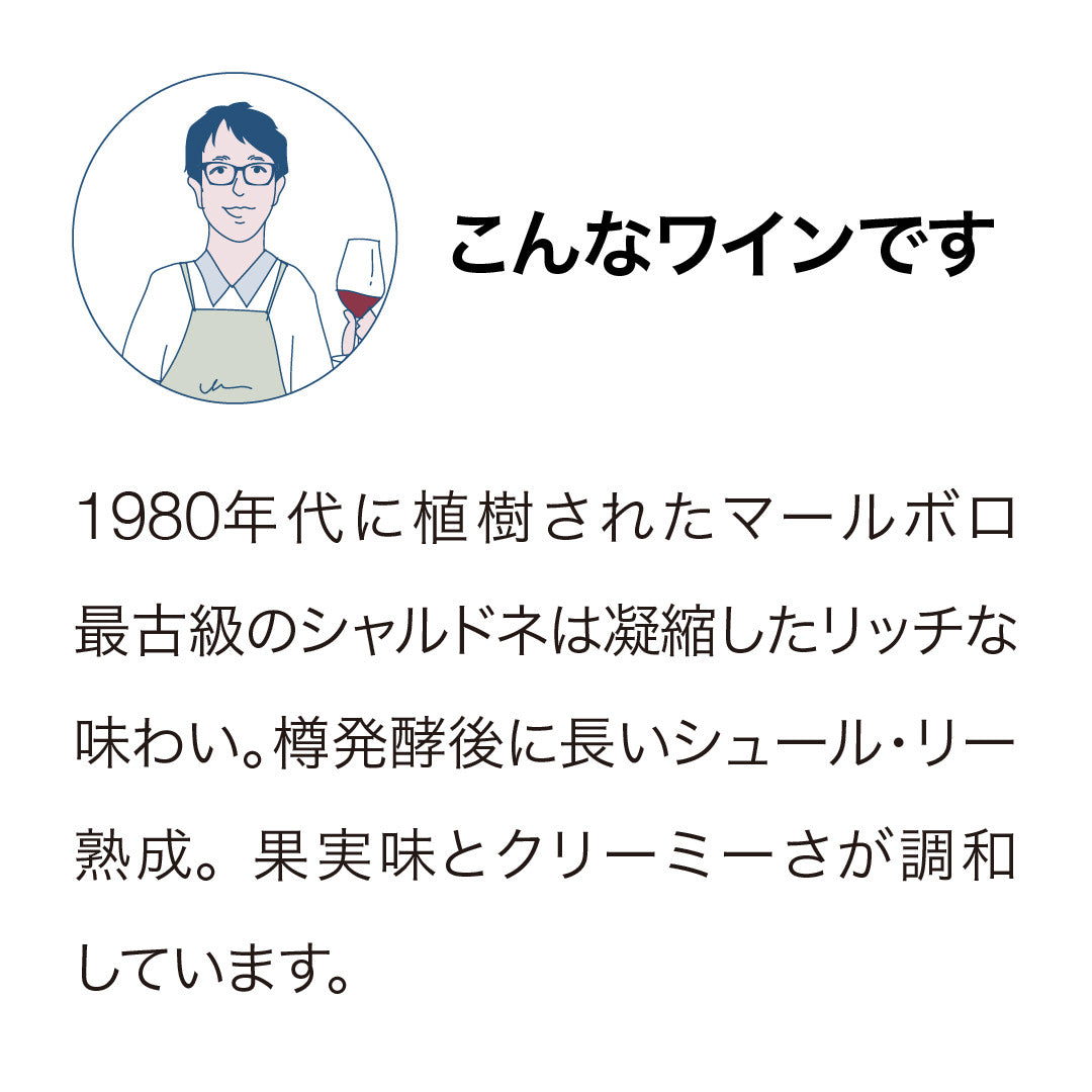 1980年代に植樹されたマールボロ最古級のシャルドネは凝縮したリッチな味わい。樽発酵後に長いシュール・リー熟成。果実味とクリーミーさが調和しています。
