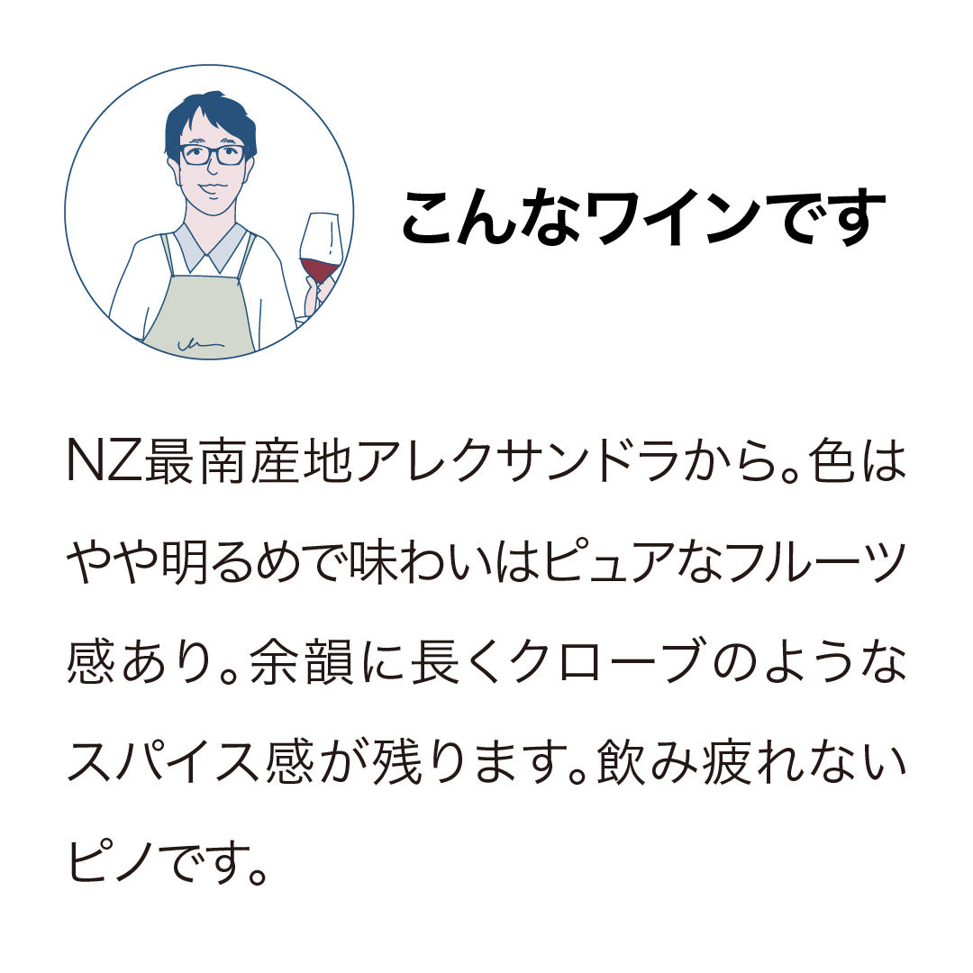 NZ最南産地アレクサンドラから。色はやや明るめで味わいはピュアなフルーツ感あり。余韻に長くクローブのようなスパイス感が残ります。飲み疲れないピノです。