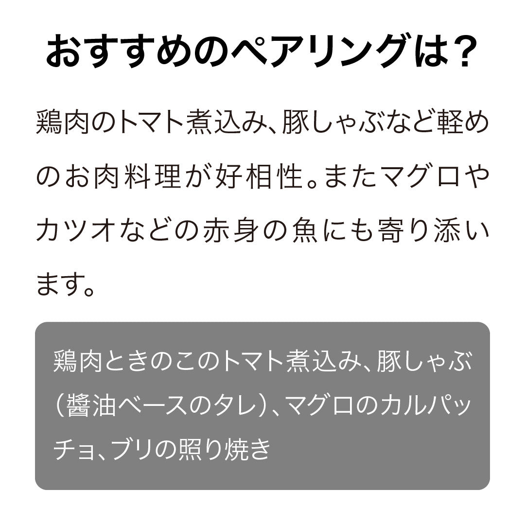鶏肉のトマト煮込み、豚しゃぶなど軽めのお肉料理が好相性。またマグロやカツオなどの赤身の魚にも寄り添います。