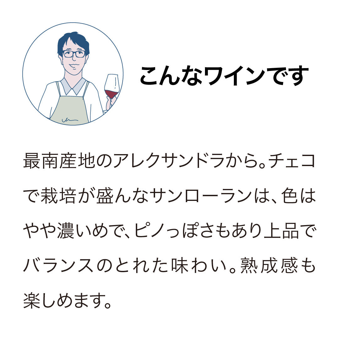 最南産地のアレクサンドラから。チェコで栽培が盛んなサンローランは、色はやや濃いめで、ピノっぽさもあり上品でバランスのとれた味わい。熟成感も楽しめます。