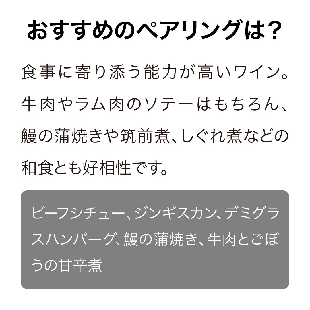 食事に寄り添う能力が高いワイン。牛肉やラム肉のソテーはもちろん、鰻の蒲焼きや筑前煮、しぐれ煮などの和食とも好相性です。
