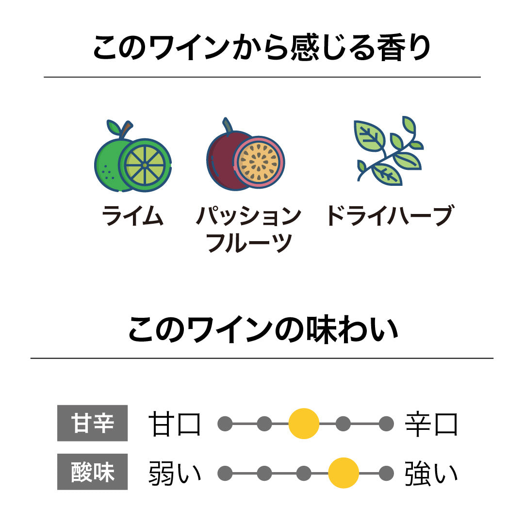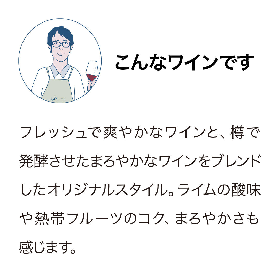 フレッシュで爽やかなワインと、樽で発酵させたまろやかなワインをブレンドしたオリジナルスタイル。ライムの酸味や熱帯フルーツのコク、まろやかさも感じます。