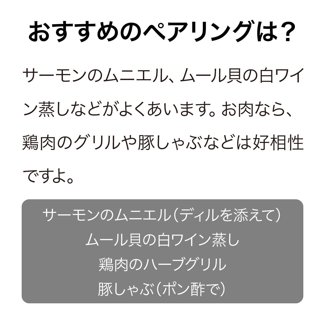 サーモンのムニエル、ムール貝の白ワイン蒸しなどがよくあいます。お肉なら、鶏肉のグリルや豚しゃぶなどは好相性ですよ。
