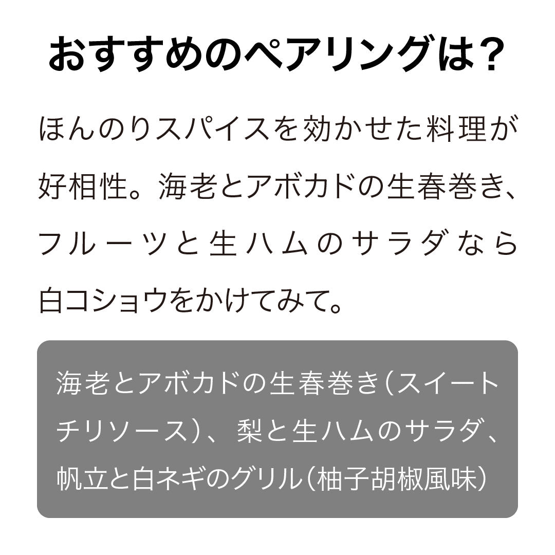 ほんのりスパイスを効かせた料理が好相性。海老とアボカドの生春巻き、フルーツと生ハムのサラダなら白コショウをかけてみて。