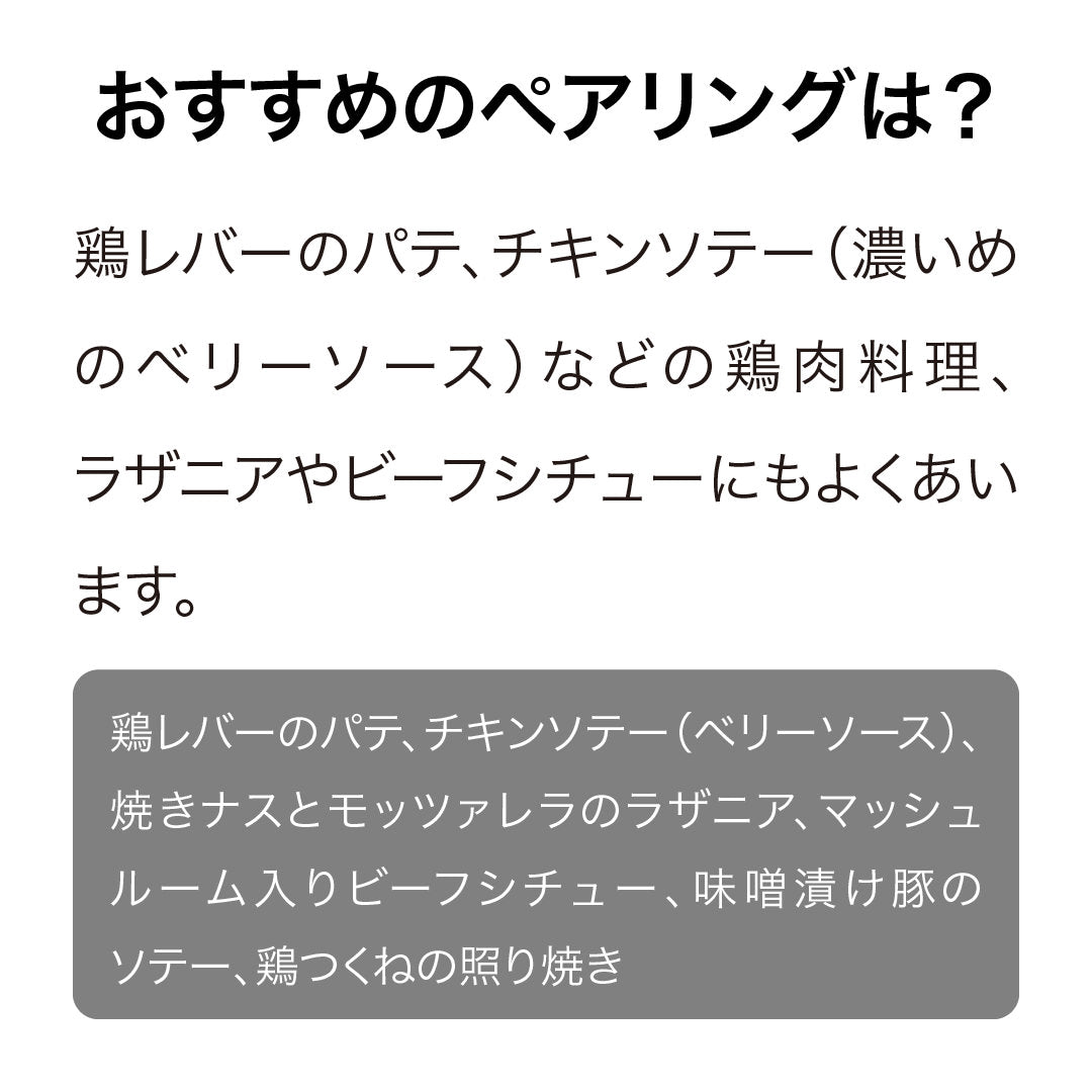 味わいは、やわらかめ。ブルーベリーやすももなど果実に続いて、ハーブやスパイスのフレイバーが広がり、奥行きある仕上がりに。タンニンはややまろやかで、全体として柔らかさが貫かれた味わいとなっています。3〜5年後にはさらにまろやかになっているでしょう。