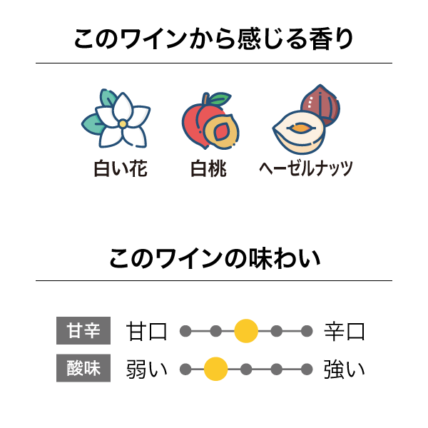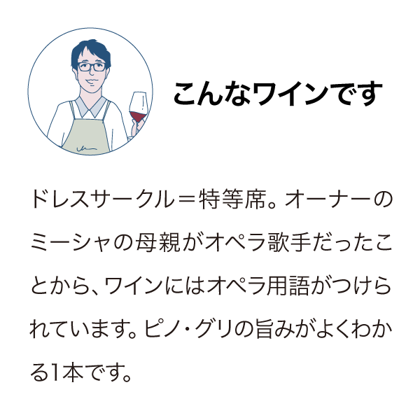 ドレスサークル=特等席。オーナーのミーシャの母親がオペラ歌手だったことから、ワインにはオペラ用語がつけられています。ピノ・グリの旨みがよくわかる1本です。