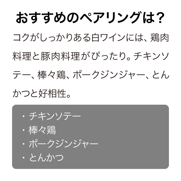 コクがしっかりある白ワインには、鶏肉料理と豚肉料理がぴったり。チキンソテー、棒々鶏、ポークジンジャー、とんかつと好相性。