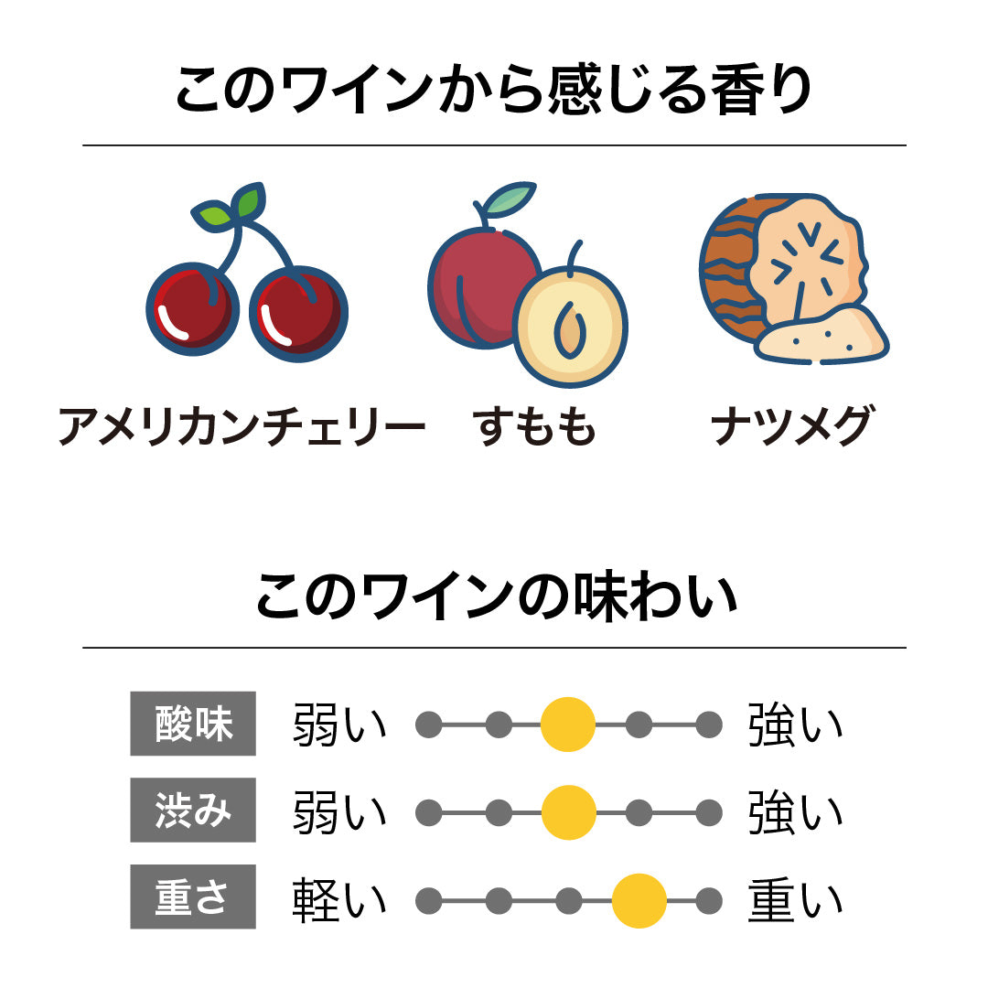 口に含むと、柔らかく明るい印象。さくらんぼやすもものようなフルーティーな味わいが広がります。渋みは控えめで後味にはほんのりスパイスが残ります。