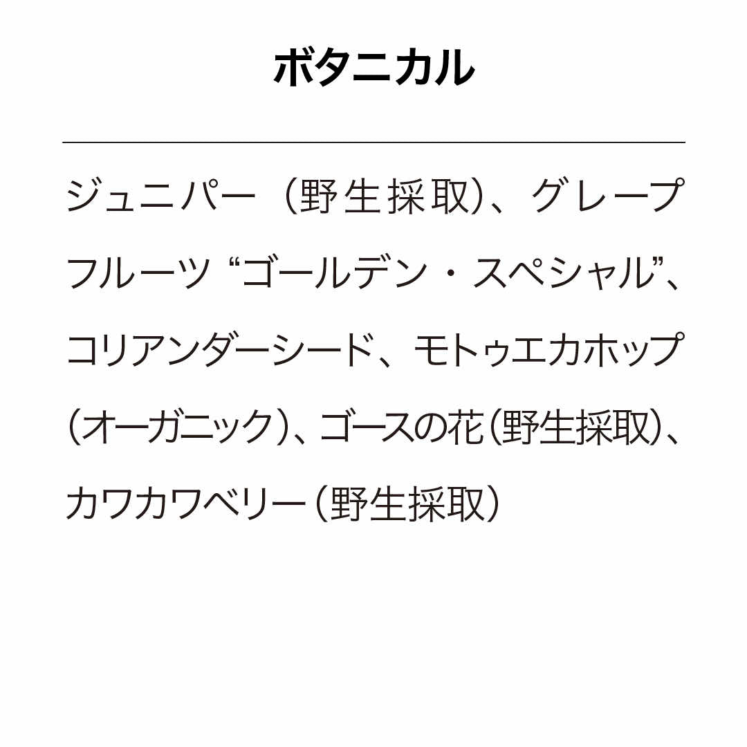 | ボタニカル | ジュニパー(野生採取)、 グレープフルーツ “ゴールデン・スペシャル”、 コリアンダーシード、 モトゥエカホップ(オーガニック)、 ゴースの花(野生採取)、 カワカワベリー(野生採取) |